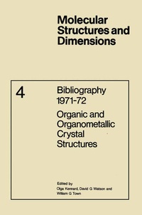 This volume is the fourth c1assified bibliography of organic and organometallic crystal structures prepared by the Crystallographic Data Centre, University Chemical Laboratory, Cambridge, and published jointly with the International Union of Crystallography. The first three volumes covered the years 1935-1971. The present volume provides references principally to compounds whose struc tures were reported in the literature during 1971-1972. A few structures published prior to 1971 and omitted from the previous volumes are also inc1uded. The arrangement of entries in the 86 chemical c1asses is identical with the previous volumes and the reader is referred to the Introduction in Vol. 1 or Vol. 2 for a description of the practical use of the bibliography. There are three cumulative indexes in the present volume: formula, transition metal and author indexes. All three cover the period 1935- 1972 and give references to entries in Vols. 1-4. The bibliography and indexes were prepared, checked and printed by computer techniques described in the previous volumes. Magnetic tapes of the four volumes are available and anyone interested should contact the Centre for further details. In the present volume we have attempted to improve the cut-off date by special arrangement with the Centre National de la Recherche Scientifique, Paris, France. Und er this arrangement reprints ofpapers containing crystallographic data are now sent directly to the Crystal lographic Data Centre, Cambridge, at the same time as they are sent out to abstractors preparing material for the Bulletin Signaletique.