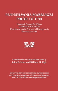Among the laws agreed upon in England for the governing of the Province of Pennsylvania was one providing for a registry of marriages, births, and deaths. Marriage licenses were issued from the Office of the Provincial Secretary, those listed in this work dating from 1742. Some earlier registers of licenses and some kept at a later date are missing, yet this work still features a base list of 6,500 marriages, to which we have added a further 3,500 marriages from articles in the Pennsylvania Magazine of History and Biography and The Pennsylvania Genealogical Magazine. All 10,000 marriages are based on public records as opposed to church records.