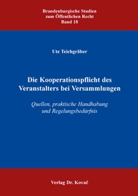 Das praktische Bedürfnis nach Kooperation im Versammlungswesen steht, jedenfalls auf Seiten des Veranstalters, in einem Spannungsverhältnis zu der nahezu uneingeschränkt gewährleisteten Versammlungsfreiheit gemäß Art. 8 GG. Ausgehend von diesem Spannungsverhältnis setzt sich Ute Teichgräber mit den (verfassungs-)rechtlichen Vorgaben sowie Inhalt und Rechtsfolgen von Kooperation auseinander. Sie betrachtet diese Aspekte für den Veranstalter einer Versammlung, aber auch für die ihm gegenüberstehende Behörde. Vor dem Hintergrund ihrer Untersuchungen schlägt sie schließlich eine einfachgesetzliche Ausgestaltung für Kooperation im Versammlungswesen vor.