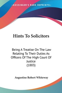 Hints to Solicitors: Being a Treatise on the Law Relating to Their Duties as Officers of the High Court of Justice (1883) is a legal guide written by Augustine Robert Whiteway. The book provides a comprehensive overview of the legal responsibilities and duties of solicitors as officers of the High Court of Justice in England. It covers a wide range of topics, including the qualifications and admission requirements for solicitors, their duties to clients, the rules of professional conduct, and the various procedures and practices that solicitors must follow in order to effectively represent their clients in court. The book is a valuable resource for practicing solicitors, law students, and anyone interested in the legal profession. It is written in a clear and concise style, making it accessible to readers of all levels of legal expertise. Overall, Hints to Solicitors is a must-read for anyone seeking to understand the role of solicitors in the English legal system.With Notes On The Recent Changes Affecting The Profession, And A Vade Mecum.This scarce antiquarian book is a facsimile reprint of the old original and may contain some imperfections such as library marks and notations. Because we believe this work is culturally important, we have made it available as part of our commitment for protecting, preserving, and promoting the world's literature in affordable, high quality, modern editions, that are true to their original work.