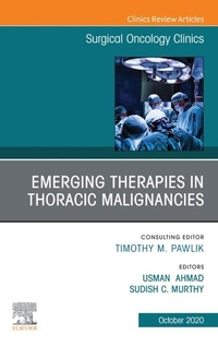 This issue of Surgical Oncology Clinics of North America, guest edited by Drs. Usman Ahmad and Sudish Murthy, is devoted to Emerging Therapies in Thoracic Malignancies. Drs. Ahmad and Murthy has assembled expert authors to review the following topics: Mediastinal Germ Cell Tumors: Updates in Diagnosis and Management; Multidisciplinary Evaluation and Management of Early Stage Esophageal Cancer; Evaluation of Risk for Thoracic Surgery; Mesothelioma: Updates in Staging and Management; Chest Wall Sarcoma: When and Who to Resect and How to Reconstruct; Management of Locally Advanced Esophageal Cancer; Locally Advanced Lung Cancer and Salvage Resections; Siewert III Adenocarcinoma: Still Searching for the Right Treatment Combination; Current Indications for Pulmonary Metastasectomy; Lung Cancer Screening; Thymic Malignancies: Updates in Treatment and Staging; Intra-operative Detection and Assessment of Lung Nodules; Targeted Therapies, Immunotherapy and T-Cell Therapy in Lung Cancer; and more!