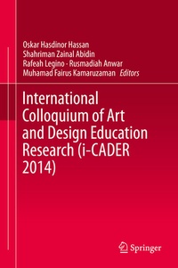 Chapter 1: Structured Planning as a Front-end Process for Concept Design and Development.- Chapter 2: Traditional Keris Pandai Saras Design.- Chapter 3: Innovation Culture: An Evaluation of Academicians in Universiti Teknologi MARA Branch Campuses.- Chapter 4: Microscopic Image and Text Examination of Conventional and Digital Print-outs.- Chapter 5: Theoretical Framework Study on Formgiving Mobile Education Game Design Technology.- Chapter 6: Anthropomorphism in Political Cartoon: Case Study of the 1965 Malaysia- Indonesia Confrontation.- Chapter 7: Developers View: Understanding the Importance of the Courseware Interfaces as Part of the Software Development Process.- Chapter 8: A Randomized Pilot Study to Determine the Effectiveness of Assistive Technology Based Dynamic Visual in Cognition Stimulation Towards Alzheimer's Patients.- Chapter 9: Socioeconomic and Political Implications for Ethnic and National Sentiments: The Impact on Nation-Building Policy Efforts.- Chapter 10: The Effectiveness of Visual Rhetoric in Public Awareness Prints Advertising as A Social Culture Space in Malaysia.- Chapter 11: A Recognizable Symbol of Wedding Ring as a Communication Object to Portray Marital Status.- Chapter 12: 'Gasing' as a Commercialize Games Product in Malaysia.- Chapter 13: Rivet in Ceramic: Method of Past and Present Restoration.- Chapter 14: Comparison of Natural and Synthetic Adhesives for Ceramic Conservation.- Chapter 15: Interrater Agreement for Process Loss Measures: Are They Applicable for Brainstorming Technique in Industrial Design Practices?.- Chapter 16: Stoneware Clay as a Replacement Material for Artificial Reef Design.- Chapter 17: The Exploration Methods of Consistent Raku Firing Glaze Effect Framework.- Chapter 18: Photo Exemplars Classification: The Integration Photographic History Into Photographic Technique.- Chapter 19: Construction of Design: A Formal Proposition of Graphics Analysis of Comics.- Chapter 20: Empirical Study on Game-based Learning Phenomenon Through Mobile Design Technology.- Chapter 21: The Concept of Formgiving for Color and Trim in Car Design.- Chapter 22: Unity through Arts: An Approach for Harmony among Children in Malaysia in Achieving the Concept of One Malaysia.- Chapter 23: 'Kuih Putu' Mould as a Matrix for Alternative Printmaking: Transformation Towards an Artistic Interpretation.- Chapter 24: The Study of Proverbs as A Way to Enhance Ethical Values in Artwork.- Chapter 25: A Game-based Learning: A Study on Wau Among Selected University Students in Klang Valley, Malaysia.- Chapter 26: Role of Mobile Web-Based Technology Towards Online Grocery Shopping in Malaysia.- Chapter 27: A Comparative Study of the Appreciation of Local Malaysian Culture in the Artworks of Ilse Noor and Tina Rimmer.- Chapter 28: Preservation Characteristics of Malay Garden: A Catalyst for Sustainable Cultural Landscape in Malaysia.- Chapter 29: The Exploration Technique of Nature for Contemporary Batik Design.- Chapter 30: Promoting the Culture of Philanthropy in Malaysia.- Chapter 31: Elaborating Context from the Content Making Framework.- Chapter 32: Visual Advertisement Images in the Wanita Magazine; an Empirical Study Towards Women Stereotype.- Chapter 33: A Blended Method for Generating Creative Product Concepts.- Chapter 34: Symmetrical Pattern: Analysing Songket in Wallpaper Patterns.- Chapter 35: Conceptual Labyrinth Pattern Design for Ceramic Stoneware Art Form.- Chapter 36: SCAMPER for Character Design Unique Zoo Creature.- Chapter 37: Framework Muwajjah as an Islamic Art Decoration Through Formgiving Process.- Chapter 38: Furniture Design Identity Implementation of National Identity Into Office Chair Design.- Chapter 39: Designing Conceptual 3D Tessellation Ceramic Optical Illusions.- Chapter 40: Paper Clay Study Development for Ceramic Art Form Design.- Chapter 41: Corn Husk Fiber in Songket Weaving for Cottage Industry.- Chapter 42: Luminescence Glaze as Third Decoration on Ceramic Surface.- Chapter 43: A Reference to Usability Inspection Methods.- Chapter 44: From Subjectivity to Objective Evaluation: A Techno-Rationalist Approach of Assessment Design for Art & Design Education.- Chapter 45: Correlation Cognition Behaviour and Design in Influencing Ablution Tub.- Chapter 46: Enhancement on Visual Communication for Preschool Education Using Transmedia Approach.- Chapter 47: Acculturation of Peranakan Chinese Into Malay Culture in Terengganu: Influenced to the Development of Malaysian Modern Art.- Chapter 48: The Potential of Photo Manipulation as Visualization Technique in Advertising Campaign.- Chapter 49: Developing Sarawak Motifs Elements of Ventilation Pattern Through Ceramic Stoneware Materials.- Chapter 50: Perception of Readers Towards the Crime Photographs from the Mainstream Malaysian Newspaper in Kuala Terengganu.- Chapter 51: Classification of Frieze Patterns in Malay Songket Textile.- Chapter 52: Mengkuang Pattern of Plaiting as an Aesthetic Design in Kedah.- Chapter 53: Social Media and Cyber Crime in Malaysia.- Chapter 54: Bamboo Modular System (BMS) for New Eco Architecture.- Chapter 55: Investigating Feasibility of Mobile Learning (M-Learning) for History Lesson.- Chapter 56: An Overview of Book Printing and Publishing Industry in Malaysia.- Chapter 57: The Use of Infographics as a Tool for Facilitating Learning.- Chapter 58: Measuring Organisational Culture Performance: The Preliminary Model.- Chapter 59: To Innovate the Potential Used of Arc and Oxy-Acetylene Welding Tools as an Alternative Technique to the Expensive Foundry Works in Creating Metal Casting Sculpture.- Chapter 60: The Behaviour Patterns Towards Printed Colour Medium for Students with Hearing Disabilities.- Chapter 61: Vision 2020 Banknotes Revisited: A Semiotic Analysis of the Third Series Malaysian Banknotes.- Chapter 62: Symmetry in Malaysian Paintings: A Compositional Analysis.- Chapter 63: Graphic Elements in the Portuguese Cartography of Malacca.- Chapter 64:Preventing Ch