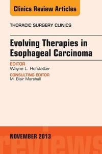 This issue of Thoracic Surgery Clinics devoted to Therapy for Esophageal Cancer will be Guest Edited by Dr. Wayne Hofstetter. Articles in this issue include: Radiographic and Endoscopic staging of esophageal cancer; Endoscopic management of HGD/Early stage esophageal cancer; Induction chemotherapy for esophageal cancer; Personalizing therapy for esophageal cancer patients; Surgery for esophageal cancer: Goals of resection and optimizing outcomes (Lymph node dissection in esophageal cancer/R0 Resection); Standardizing Esophagectomy Complications; Adjuvant therapy (post-op) for esophageal cancer; Definitive CXRT for esophageal cancer; Salvage Esophagectomy in the management of recurrent or persistent esophageal cancer; and Quality of life after curative resection for esophageal cancer.