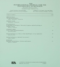 Contents: R.F. Paloutzain, Editor's Introduction. R.A. Emmons, Is Spirituality an Intelligence? Motivation, Cognition, and the Psychology of the Ultimate Concern. H. Gardner, A Case Against Spiritual Intelligence. S. Kwilecki, "Spiritual Intelligence" as a Theory of Individual Religion: A Case Application. J.D. Mayer, Spiritual Intelligence or Spiritual Consciousness? R.A. Emmons, Spirituality and Intelligence: Problems and Prospects.