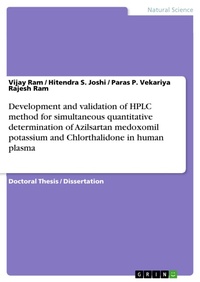 Doctoral Thesis / Dissertation from the year 2014 in the subject Chemistry - Analytical Chemistry, grade: 3, Saurashtra University (Department of Chemistry), course: Ph.D., language: English, abstract: The objective of this work was to develop a simple, cost effective, rugged and a high throughput method for simultaneous estimation of Azilsartan and Chlorthalidone in human plasma. Solid phase extraction technique is introduced here for first time and its advantages are: (I) Short processing time, (II) Significant reduction in the labour and (III) This technique minimizes chances of errors, saves considerable time and simplifies the sample preparation methodology. The run time per sample analysis of 15.0 min suggests the high throughput of the proposed method. From the results of all the validation parameters, the method proposed here can be useful for therapeutic drug monitoring both for analysis of routine samples of single dose or multiple dose pharmacokinetics and also for the clinical trial samples.