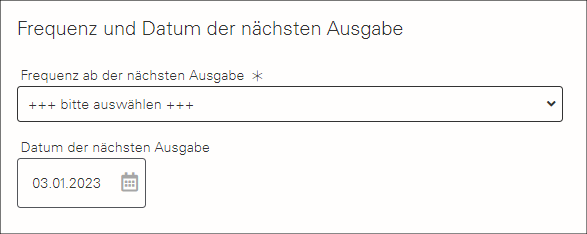 Das „Datum der nächsten Ausgabe” können Sie hier auswählen. Bei Neuanlagen wird vom System stets das aktuelle Tagesdatum vorgeschlagen, sodass Sie nach dem Speichern innerhalb von 10-20 Minuten die erste Ausgabe erhalten. Sie können aber auch ein Datum in der Zukunft eintragen, wenn die nächste Ausgabe erst in den nächsten Tagen oder der nächsten Woche erfolgen soll. Ein Datum in der Vergangenheit wird hier wie das aktuelle Tagesdatum verarbeitet.