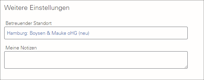 Im Feld „Betreuender Standort” finden Sie weitere Informationen und Kontaktdaten des Standortes von Schweitzer, dem Ihr Profil zugeordnet wurde. Unter „Meine Notizen” haben Sie die Möglichkeit Anmerkungen und Ideen hinzuzufügen.