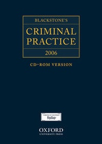 "Blackstone's Criminal Practice 2006" provides a single, well-referenced, and affordable volume of all the material that is truly essential to criminal practice in the magistrates' court and in the Crown Court. Expert commentary of uncompromising quality has ensured the book's position as a leading reference for the criminal practitioner. The 2006 edition has been fully updated and revised to cover legislative changes including; the Criminal Procedure Rules 2005; the non-molestation orders of the Domestic Violence Act 2004; sections of the Criminal Justice Act 2003 newly in force; the Attorney General's Guidelines on Disclosure; and sections of the Proceeds of Crime Act 2002 newly in force. "Blackstone's Criminal Practice 2006" is also available as a fully-linked CD-ROM, produced in Folio Views, which includes the full text of relevant statutes from 1996-2005, CPS Charging Standards, the Asylum and Immigration (Treatment of Claimants) Act 2004; the Domestic Violence, Crime and Victims Act 2004; the Hunting Act 2004. The CD is also available together with the book as a pack.