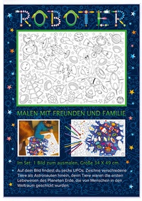 Auf dem Bild ist die kleine Rakete Piu-Piu umgeben von Robotern, Satelliten, UFOs und Himmelskörpern abgebildet. Mit Freunden und Familie kann das 34 x 49 cm. große Bild gemeinsam ausgemalt werden. Größe: 34 x 49 cm.