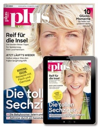 "plus Magazin" ist die Zeitschrift für alle Junggebliebenen, Aktiven und Unternehmungslustigen - das Magazin für alle ab 50 Jahre. "plus Magazin" ist das erfolgreiche Magazin für Best Ager auf dem deutschen Markt. Es ist die deutsche Ausgabe eines internationalen Konzepts, das mehr als acht Millionen Leser schon seit vielen Jahren anspricht. Bereits heute sind 28 Millionen Deutsche über 50 Jahre alt. Das sind 34 Prozent der Bevölkerung. Bis 2030 wird diese Generation auf über 45 Prozent anwachsen. "plus Magazin"... mehr als ein Frauen-Magazin.