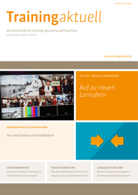 Training aktuell - die Zeitschrift für Trainer, Berater und Coachs. Monatlich liefert sie berufsrelevante Informationen, Empfehlungen und Hilfestellungen für Weiterbildungsexperten. Vorgestellt werden komprimierte Markttrends, Trainermarketing, außerdem didaktische Hilfestellung, neue Beratungsformate und Seminarbausteine, Praxistests, Visualisierungstipps, Coachingideen, neue Methoden, neue Online-Gadgets für Trainer. Auch die Zusatz-Services sind genau zugeschnitten: Abonnenten haben Zugriff auf die redaktionseigenen Marktstudien, das Beitragsarchiv und auf die speziellen Themendossiers, 20% Preisermäßigung auf die Fachbücher der Edition, günstigere Tickets für die Petersberger Trainertage, Messefreikarten und einen 50%-Sofortrabatt auf den Eintrag im Expertenverzeichnis "Die WeiterbildungsProfis".