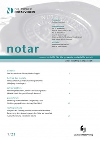 Der "notar" präsentiert sich als unverzichtbare Hilfe für den Notariatsalltag, wissenschaftlich fundiert, dabei jedoch immer praxisnah, versehen mit journalistischem Anspruch sowie der nötigen Portion Humor. Damit Ihnen nichts Wichtiges entgeht! Die von einem engagierten Schriftleiterteam betreute Zeitschrift bietet Ihnen alles, um "up to date" zu bleiben, u.a.: